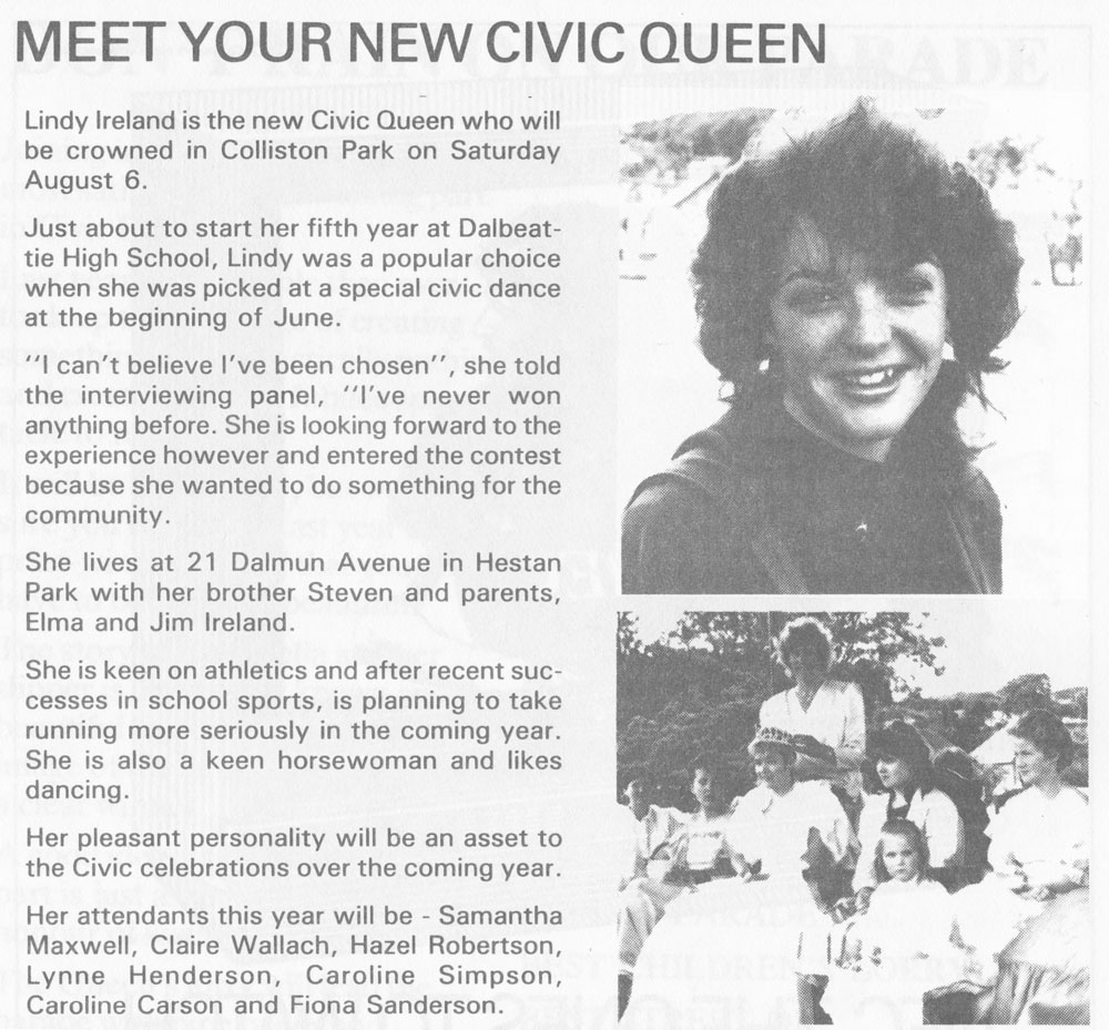 Lindy Ireland was the Civic Queen, who was about to start 5th year at Dalbeattie High School. Lindy was a popular choice when she was picked at a special civic dance. Lindy lived at home with her brother Steven and parents Elma and Jim Ireland. Her pleasant personality will be an asset to the Civic celebrations over the coming year.