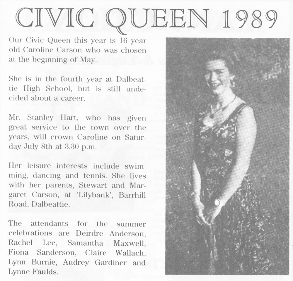 Civic Queen for this year was Caroline Carson. She is in 4th year at Dalbeattie High School, but is undecided about a career. She loves swimming, dancing, and tennis. Caroline lives with her parents, Stewart and Margaret Carson.