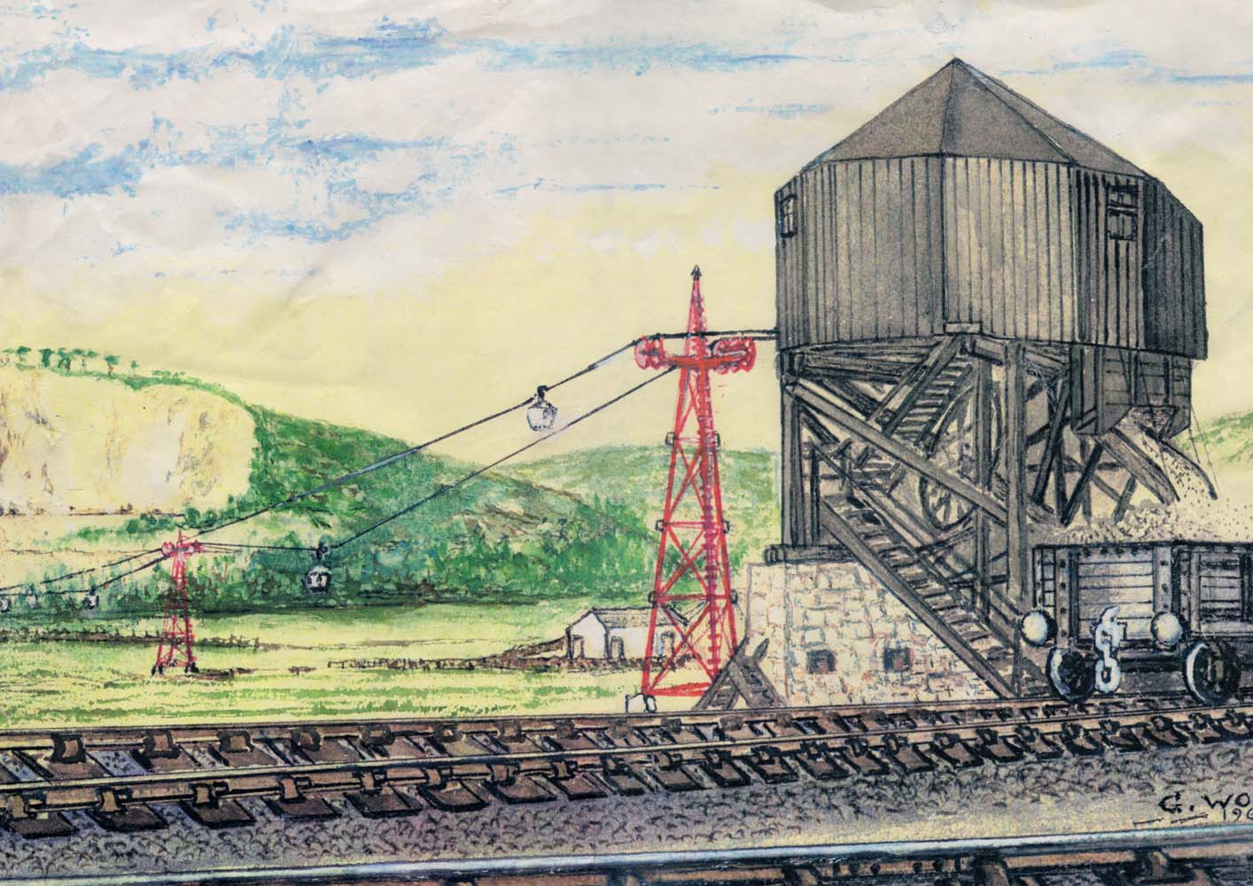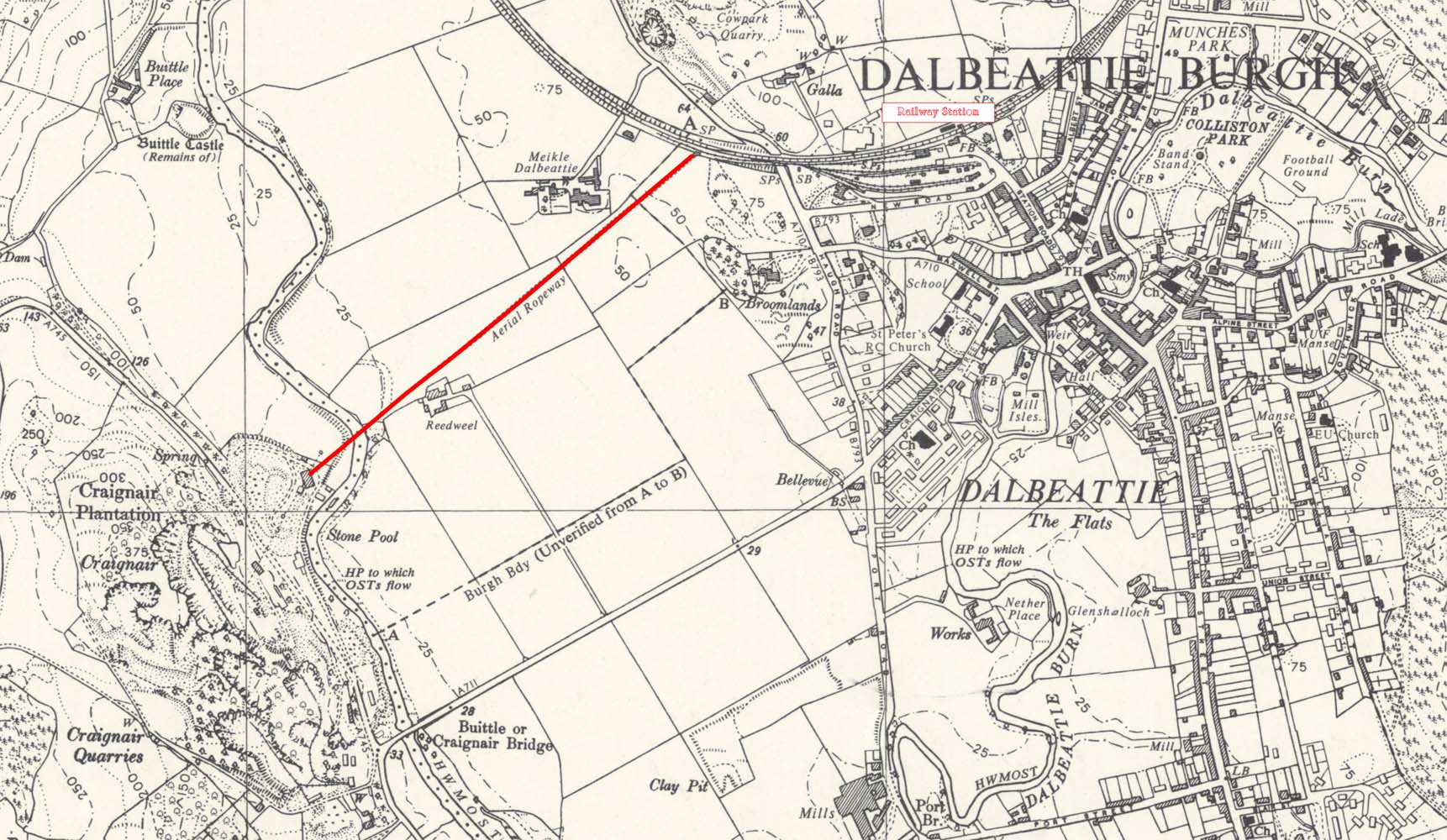 An aerial ropeway served the nearby Craignair Quarries between 1902 and 1961. Twenty two 6cwt buckets of crushed granite were carried the 870 yards across the Urr valley to the station. The ropeway was suspended from six tower-like steel trestles, each being between 30 and 50 foot high with two large pulleys on either side. Two hundred tons of granite was carried daily from the quarry to railway wagons without being touched by hand. In the crusher building a six horse-power vertical engine drove the ropeway. Railway wagons are run alongside the station terminal and filled direct from the buckets. The wagons then pass over a weighing-machine specially constructed for the purpose. The ropeway is the first of the kind erected in Scotland.